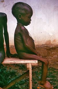 Diese geringe Nahrungsaufnahme kann aufgrund von Nahrungsmittelmangel in sehr armen Gegenden kommen, in denen die Menschen keinen Zugang zu einer Basisernährung haben.